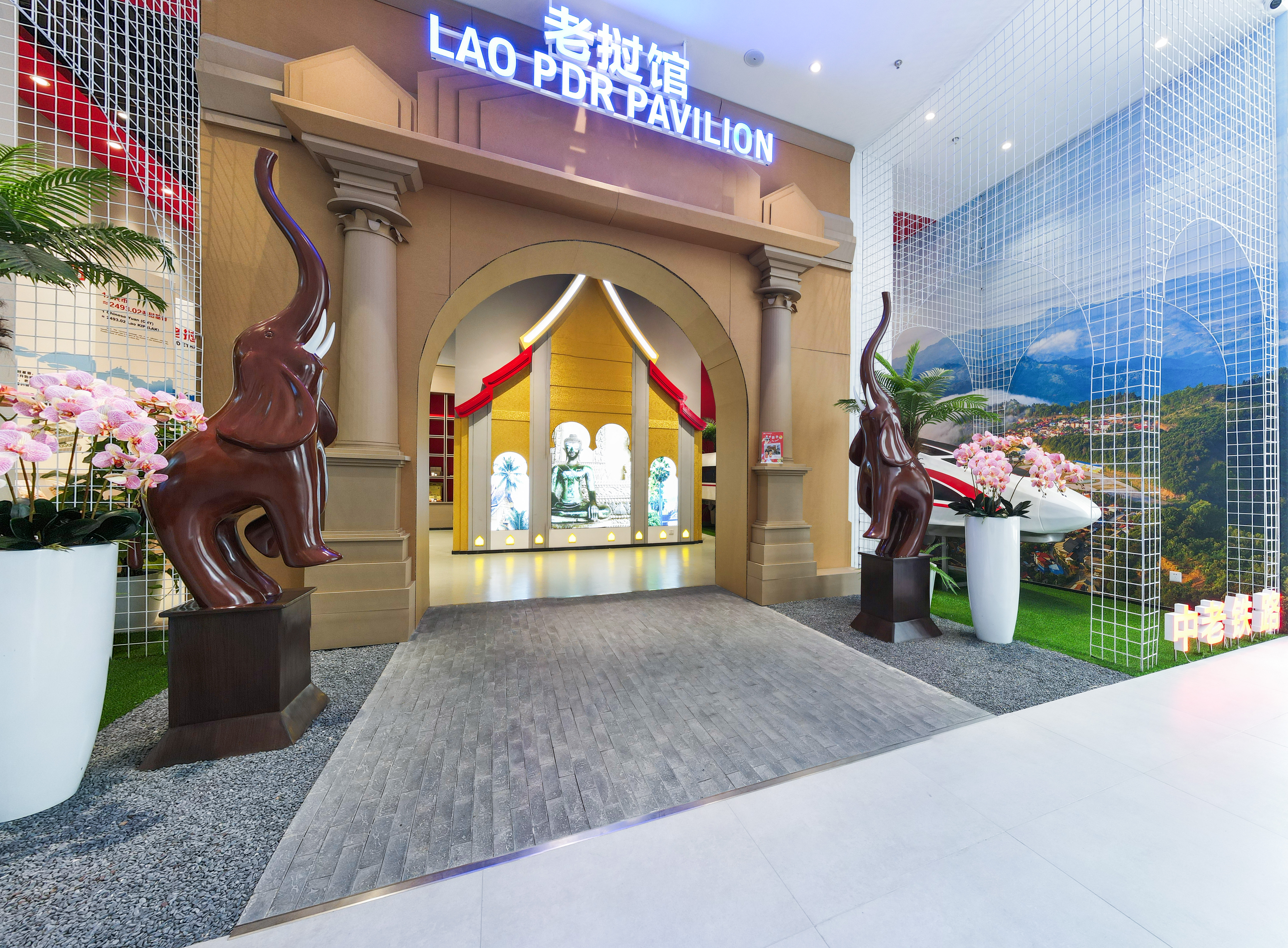 來到老撾館,考察團立即被醒目的、象征中老友誼的“中老鐵路”所吸引。入口處兩尊工藝精湛、栩栩如生的大象木雕,以及仿照老撾凱旋門廣場精心設計的門頭造型,都令考察團成員仿佛置身老撾。當得知老撾的啤酒、茶葉等特色商品通過匯聚中心線上線下平臺受到了越來越多的消費者青睞時,希帕占·南塔馮薩副主席深表感謝,也非常感動在中國還有如此創意且專為老撾商家進行商品展銷的展館,為老撾商家創造了無限商機,讓更多的人通過匯聚中心知道老撾、了解老撾進而走進老撾,也成為促進中老雙邊經貿往來的重要窗口!