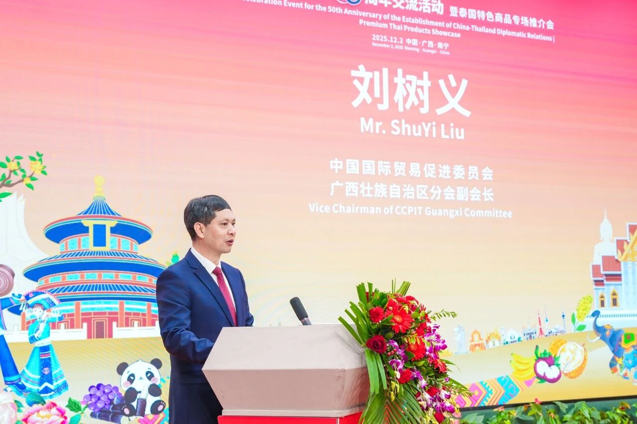 劉樹義副會長在致辭中表示, 廣西始終把深化桂泰合作作為服務國家戰略的重要抓手,穩步把“中泰一家親”的理念轉化為實實在在的合作成果。他希望以中泰建交五十周年為契機,深挖中國—東盟自貿區3.0版和RCEP的政策紅利,以本次活動為起點,以“特色商品”為紐帶,推動更多泰國水果、香米、手工藝品等特色商品通過廣西的跨境電商平臺走進中國千家萬戶,同時也鼓勵中國的機械設備、電子產品、輕工產品借助泰國市場輻射整個東盟。在此基礎上,桂泰合作必將邁上新的高度。