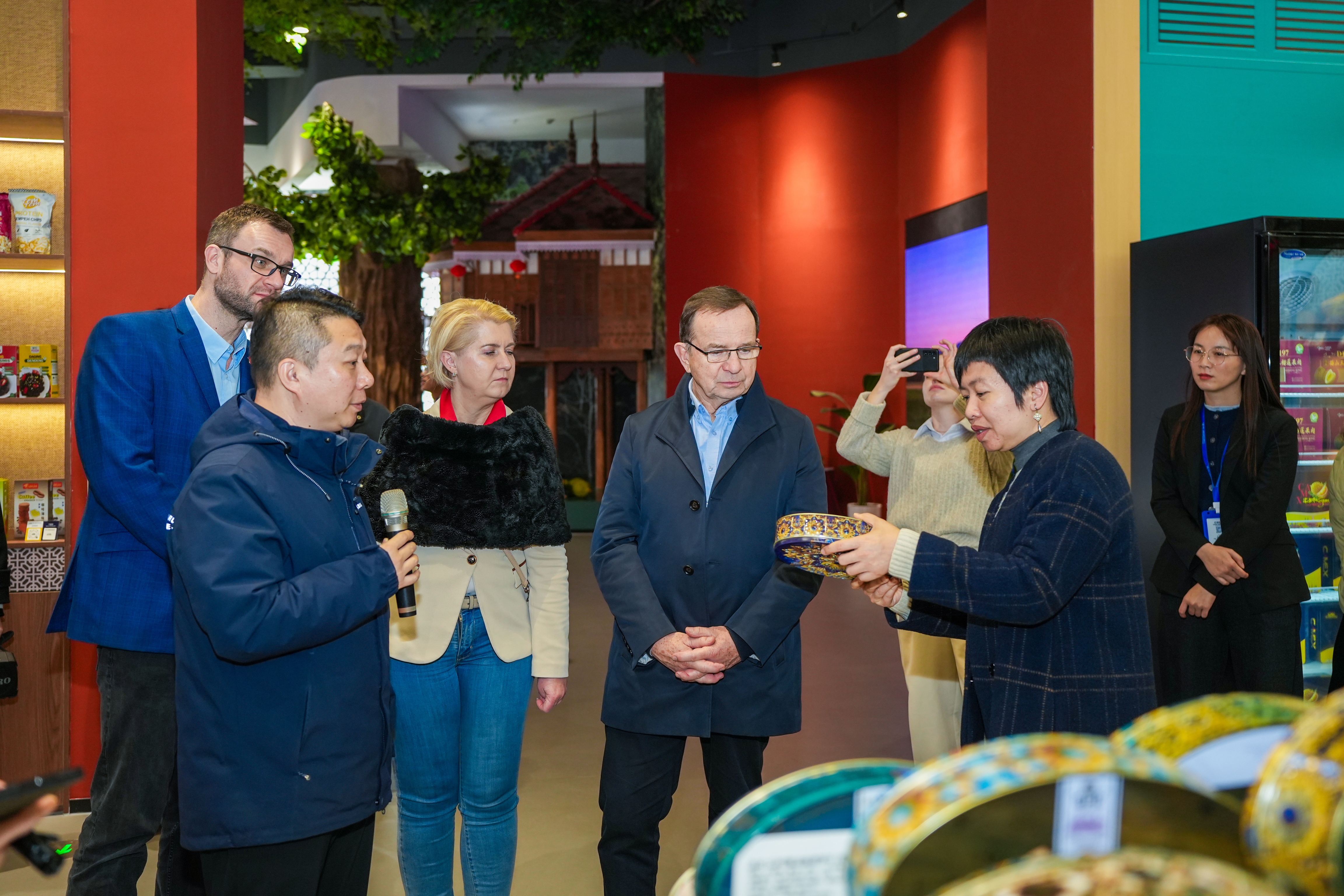 代表團實地參觀了匯聚中心精心打造的多個文化主題館。各館以鮮明的地域文化特色、場景化展示和一站式商貿體驗,生動呈現了中國與東盟各國之間的人文風情、產業優勢與廣闊前景。代表團成員在參觀過程中駐足細看、交流探討、親身體驗,直觀感受項目在助推中國與東盟經貿合作中發揮的積極作用,對這一融合文化與商貿的展示模式給予高度認可。